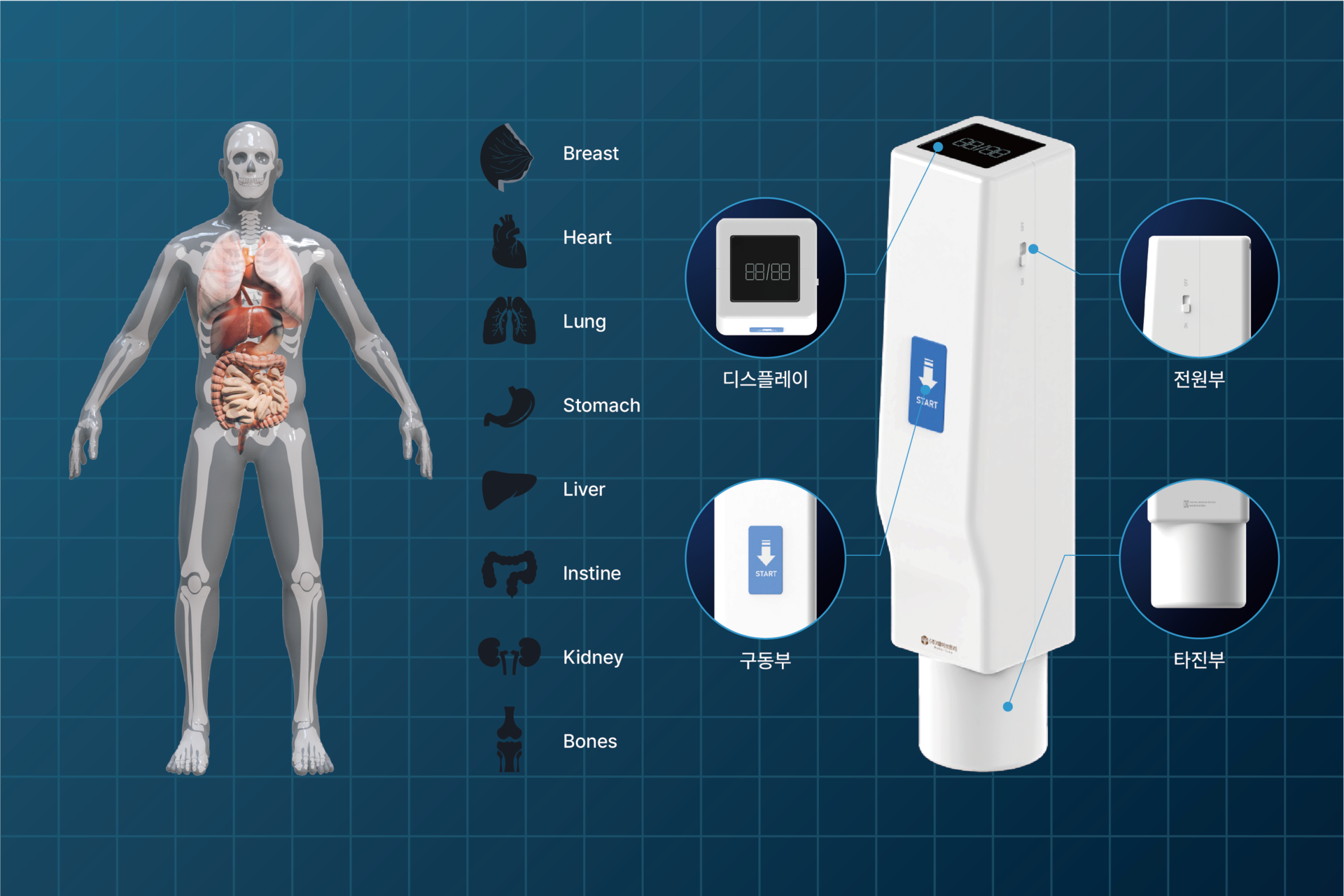 타진을 통해 기흉, 폐기종, 폐허탈, 농흉, 폐종양 외 기타 질병(복수의 유무 등)을 진단할 수 있지만, 기존 타진기의 경우 사용하는 측정자의 숙련도에 따른 진단의 문제점, 오류 등이 있기 때문에 이를 해결하기 위해 임상 현장의 활용도 및 정확도를 높일 수 있도록 데이터 정형화가 가능한 초기 진단용 디지털 기기를 개발하게 되었습니다.